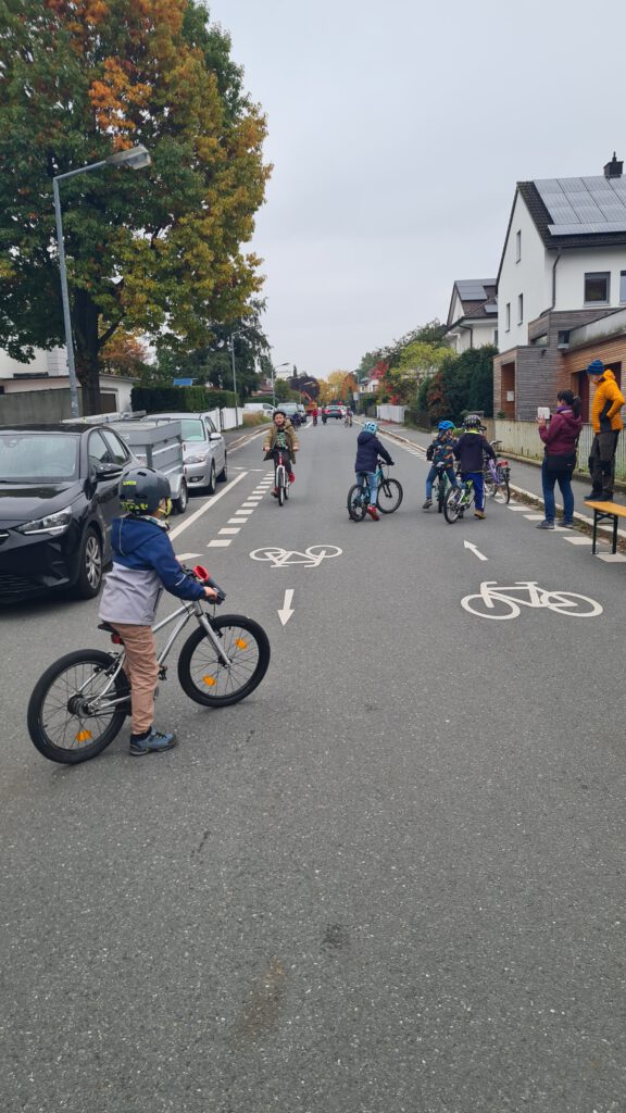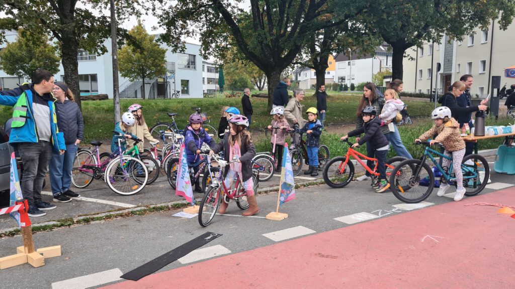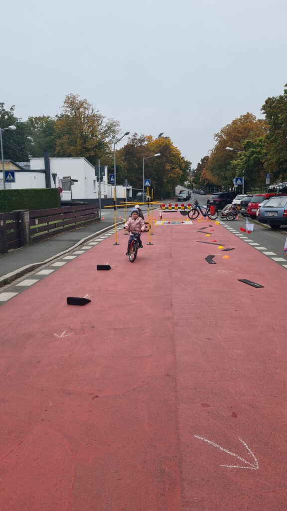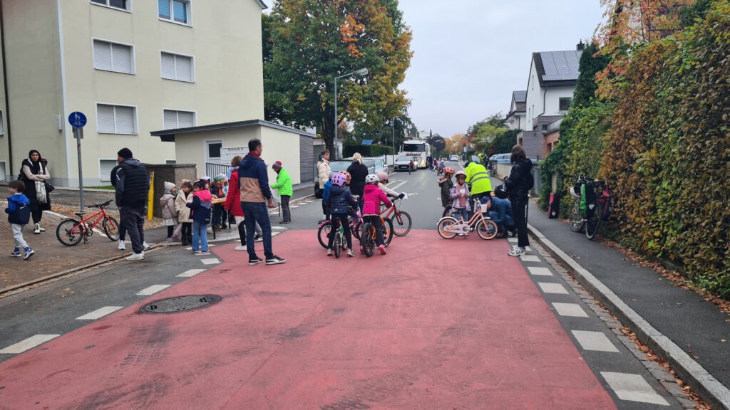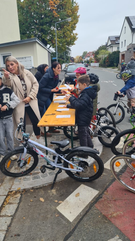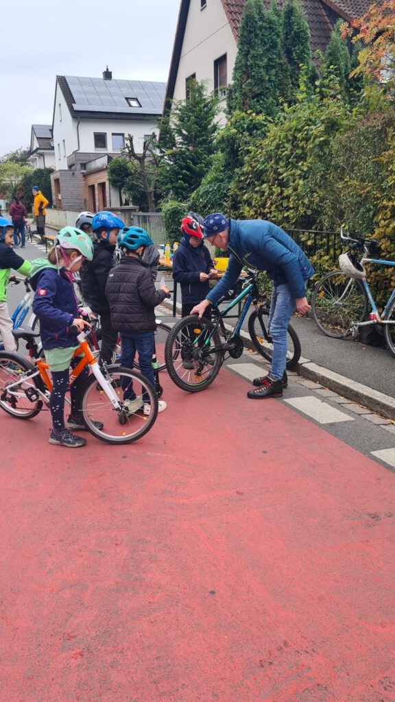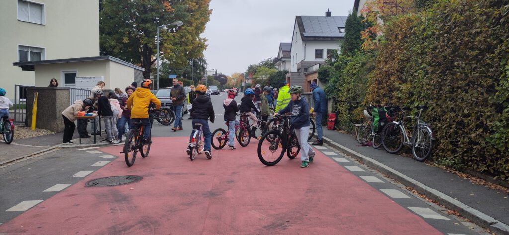 Diese Aktion am Freitag, den 10. Oktober 2025 ist eine Kooperation der Grund- und Mittelschule Kunigund, des ADFC Nürnberger Land, der Fahrradwerkstatt des Café SCH-LAU e.V. und des FabLab aus Schnaittach. Dafür wurde die Fahrradstraße von der Ahorn- bis zur Lärchenstraße gesperrt.