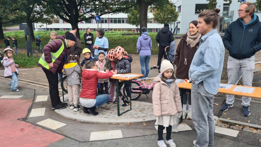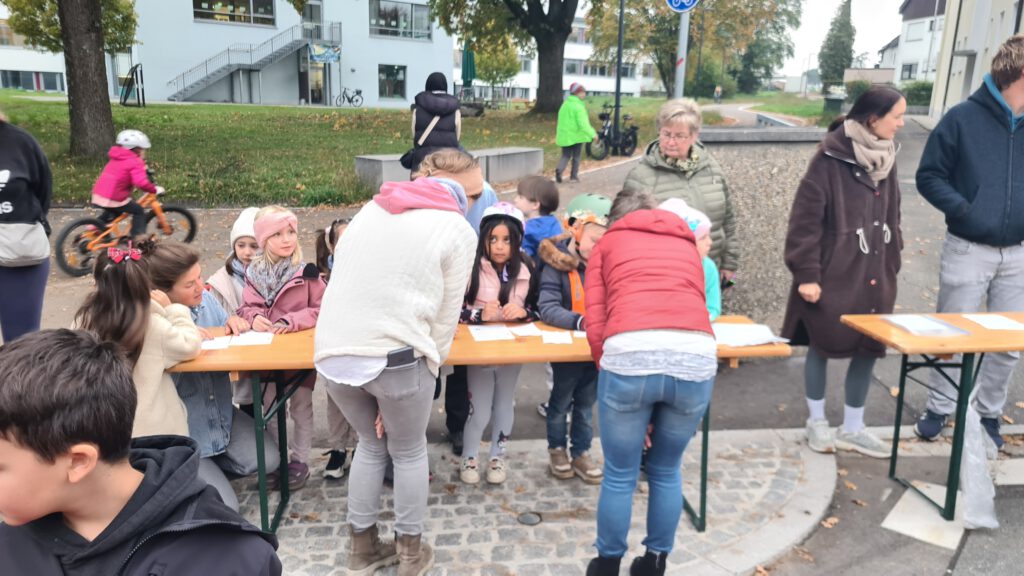Ungefähr 250 Schüler der Jahrgangsstufen 1 bis 6 nahmen daran teil. In jeder Schulstunde kam eine Jahrgangsstufe mit 2 Klassen dran. Der Elternbeirat der Grundschule bot den anwesenden Eltern, Großeltern, Lehrkräften und Aktiven Kaffee an. Für die Kinder gab es Äpfel und Kekse. Farbige Seifenblasen verzaubern Groß und Klein. So ist es ein richtiges Fest, bei dem die Schüler an 5 Stationen Stempel bekommen und viel Radfahren können.