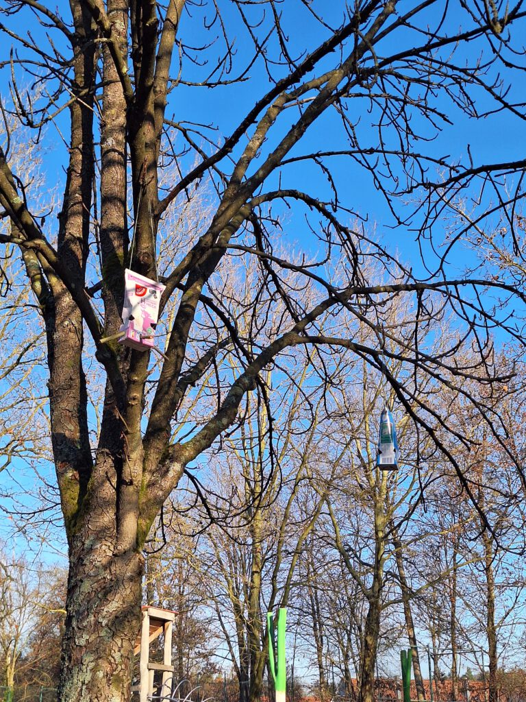 Die Klasse 1a hat vor den Weihnachtsferien fleißig aus alten Getränkekartons mehrere Futterhäuschen für Vögel gebastelt. Diese konnten nun an den Bäumen im Pausenhof aufgehängt werden. Jetzt heißt es „Daumen drücken“, damit auch die ein oder anderen Vögel unser Futterangebot entdecken. Nach den Ferien wird die 1a dann an der Aktion „Schulstunde der Wintervögel“ des LBV teilnehmen. Dabei zählen die Schüler eine Stunde lang Vögel und melden die Ergebnisse. Die Zahlen werden dann sogar in die bayernweite Auswertung der Aktion „Stunde der Wintervögel“ einbezogen.