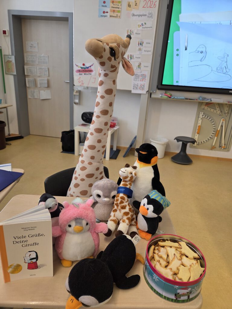 Im Rahmen des FILBY-Leseförderprogramms beschäftigte sich die Klasse 2c mit der Lektüre „Viele Grüße, Deine Giraffe“. Mit Spannung und großem Interesse verfolgten die Kinder die Brieffreundschaft zwischen einer Giraffe und einem Pinguin. Zum Abschluss feierten die Schülerinnen und Schüler ein Giraffen-Pinguin-Fest.